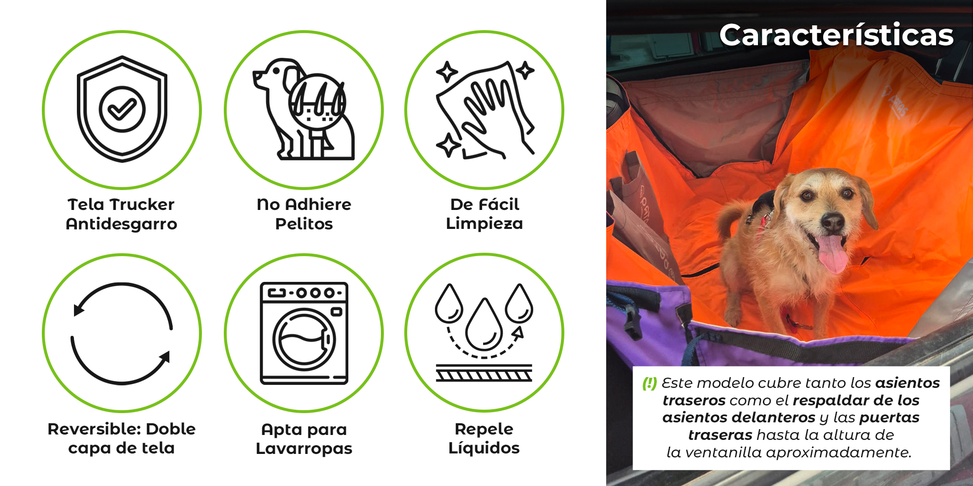 Este modelo cubre tanto los asientos traseros como el respaldar de los asientos delanteros y las puertas traseras hasta la altura de la ventanilla aproximadamente.